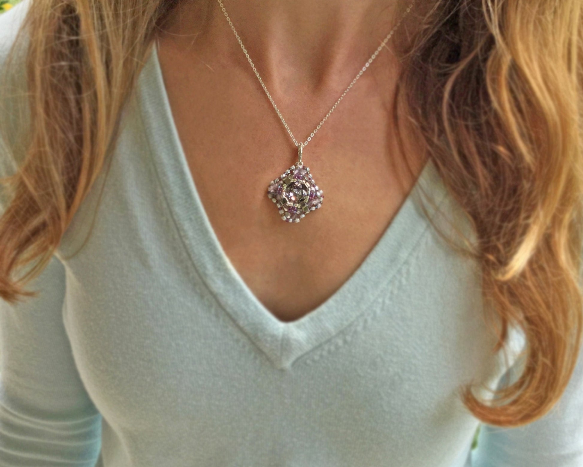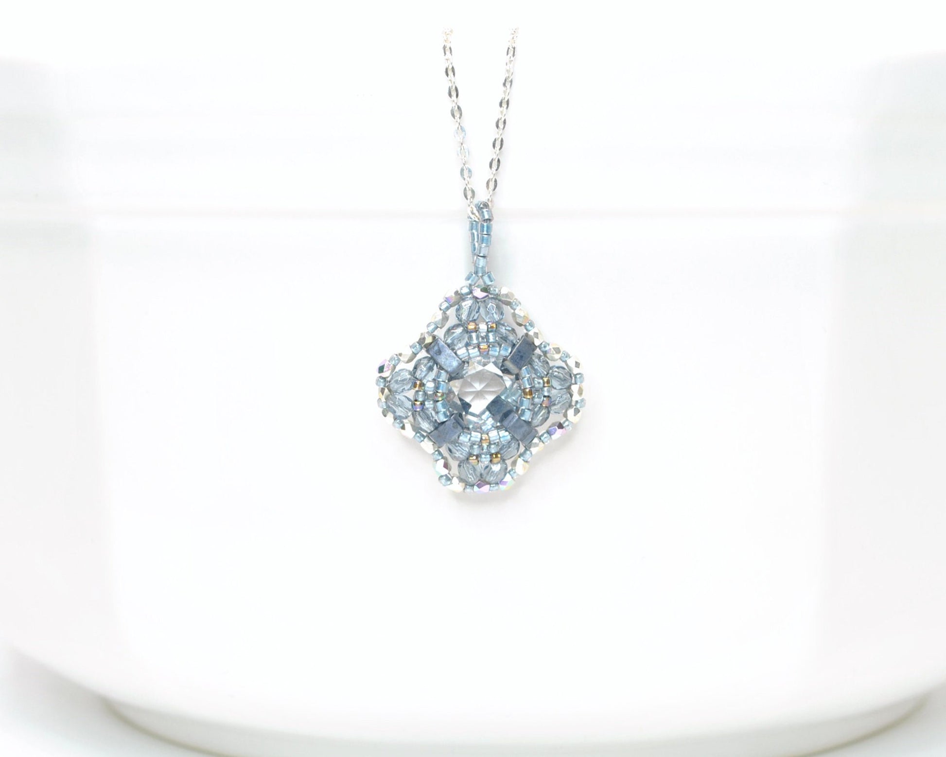 >>> this steel blue diamond-shaped beaded cushion cut pendant is formed with an intricate pattern of six different czech glass bead shapes/types, combined with two sizes and colors of japanese glass seed beads surrounding the stunning focal point of the swarovski cushion cut crystal. the color range on this piece includes a clear crystal swarovski cushion cut center, surrounded by czech glass beads in tones of blue-gray and montana blue, steel blue, a matte blue gray and a tiny antique gold japanese seed bead.