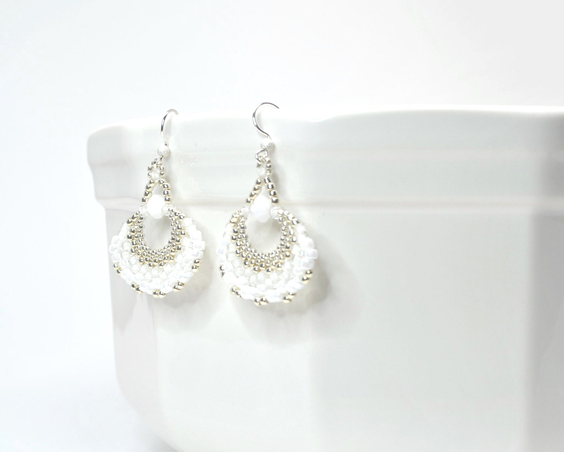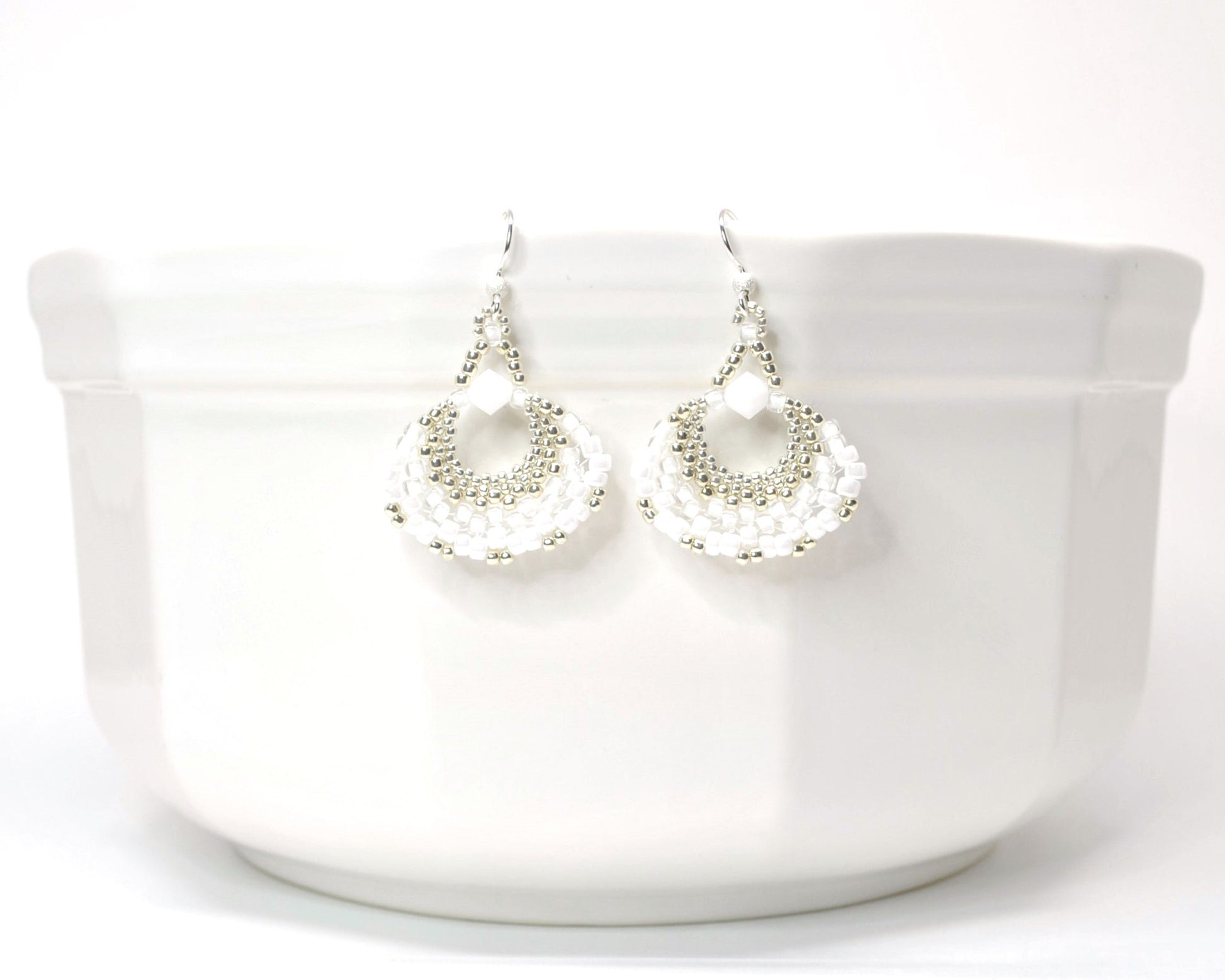 >>> these white beaded fan earrings are woven with a silvery gold toned glass beads and accented with white glass seed beads in two versions, one lined & one pearl finish. this earring is accented with a solid white swarovski crystal bead. our fan earrings feature a swarovski crystal accent bead. they are versatile enough to dress up or down. they are PERFECT for the popular neutral white trend and work for any time of the year.