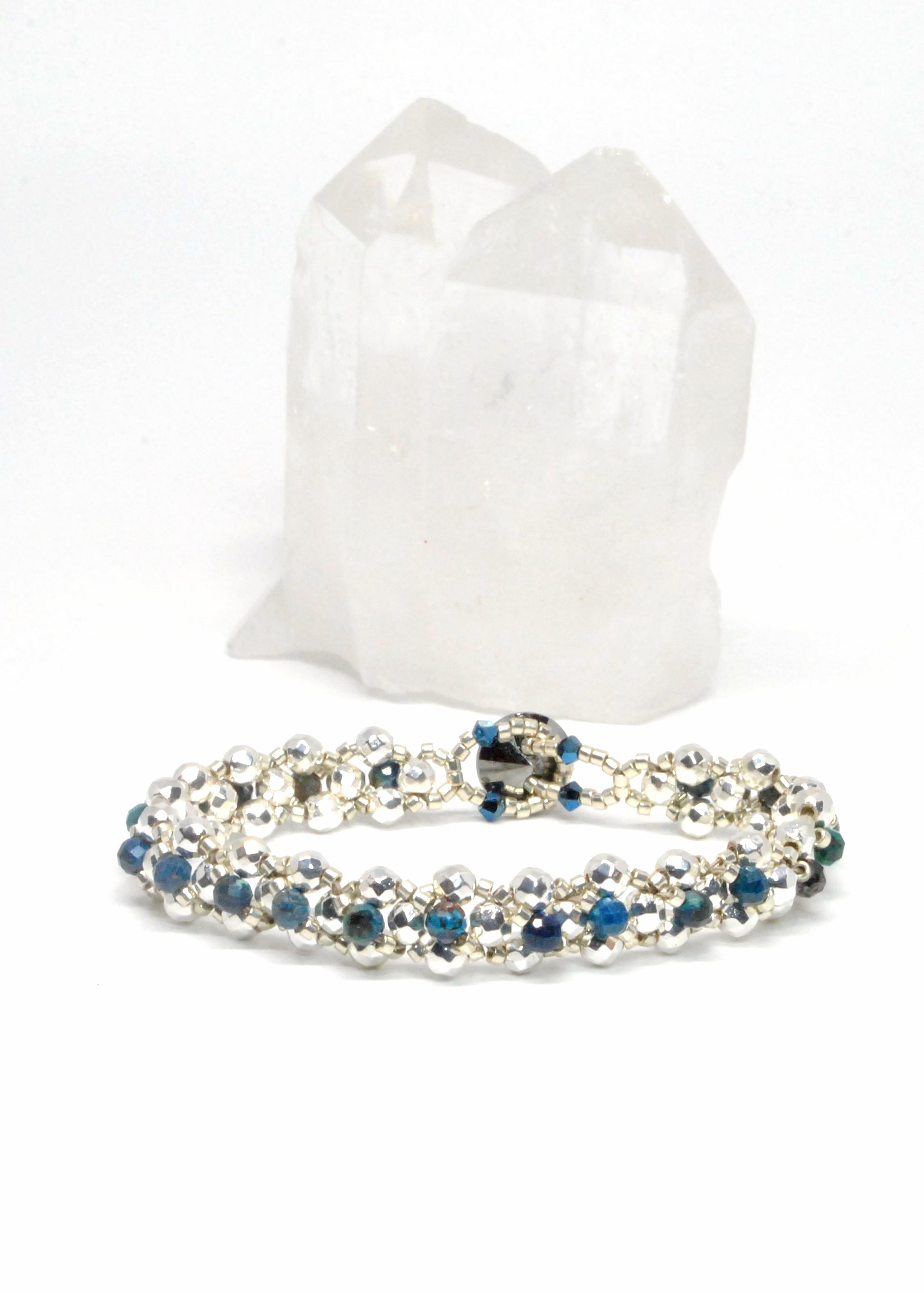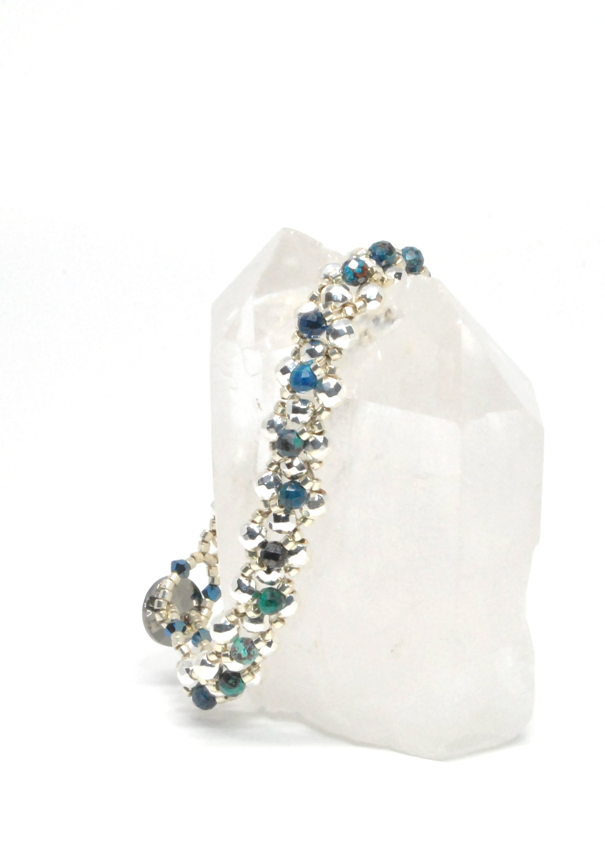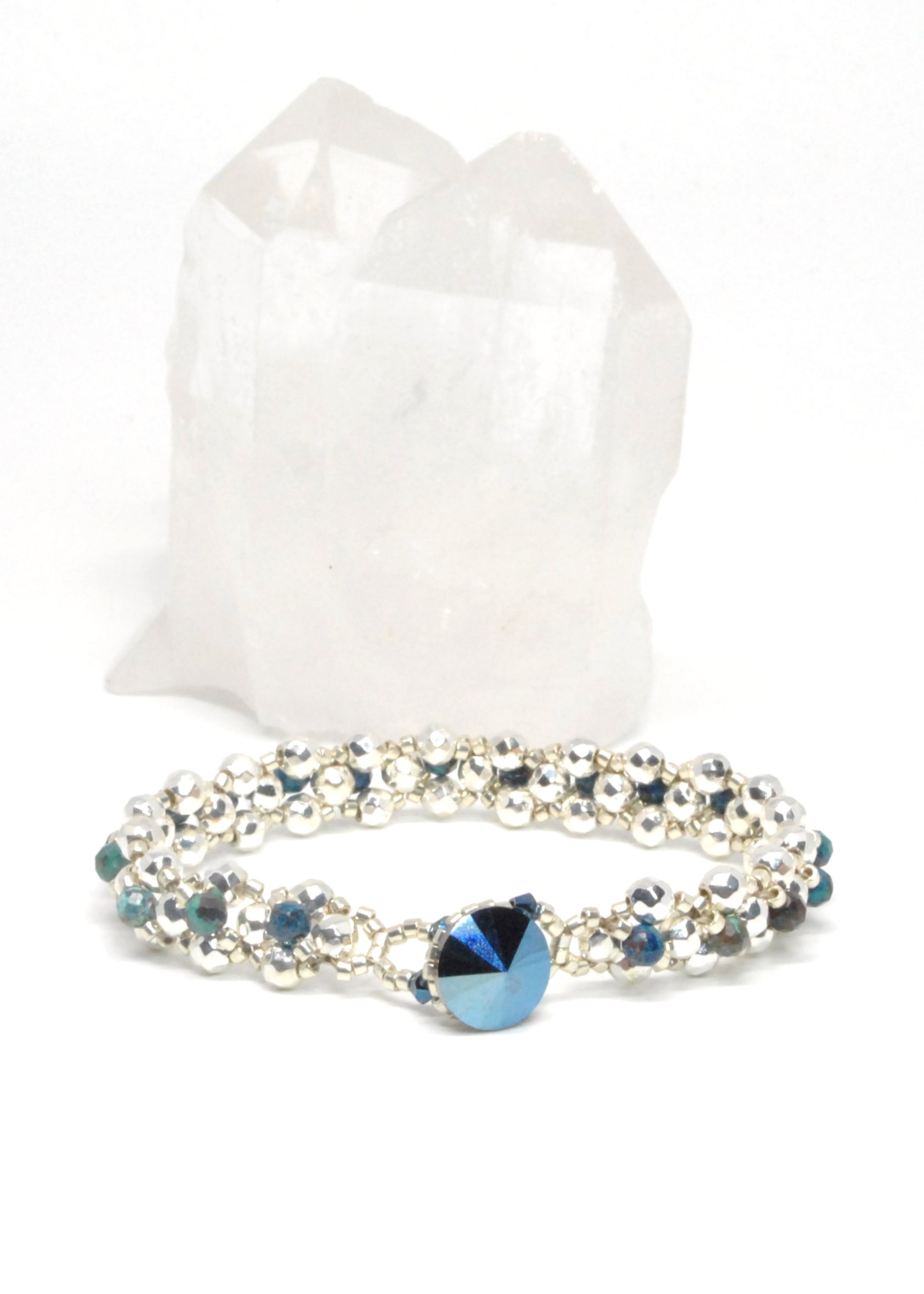 >> this bracelet is created with faceted chrysocolla beads topping a base of white silver-plated hematite faceted beads. the faceting adds additional sparkle and texture to the piece. it is finished with a Swarovski crystal metallic blue button and tiny Swarovski crystals at the closure ends.