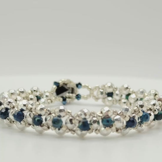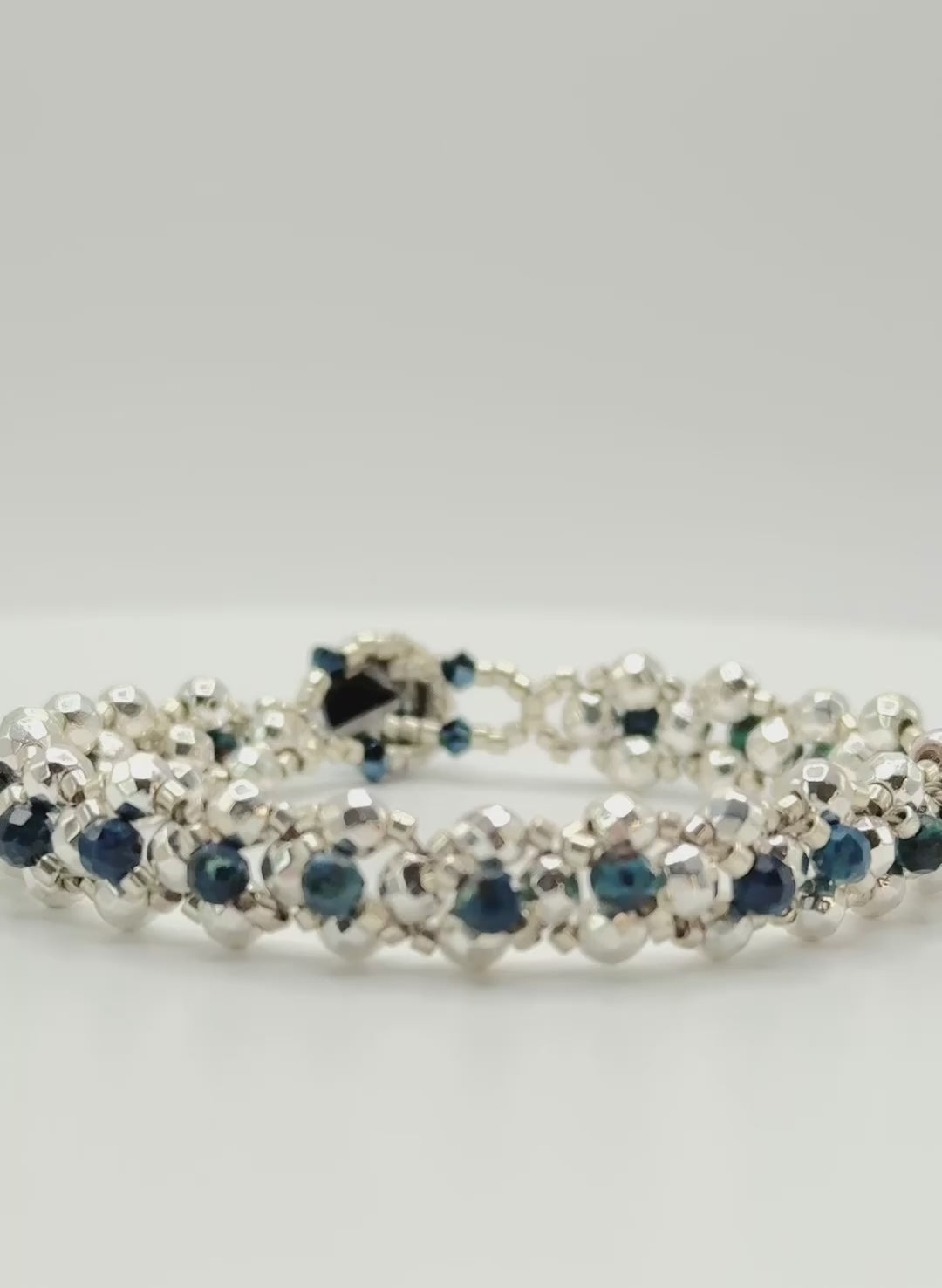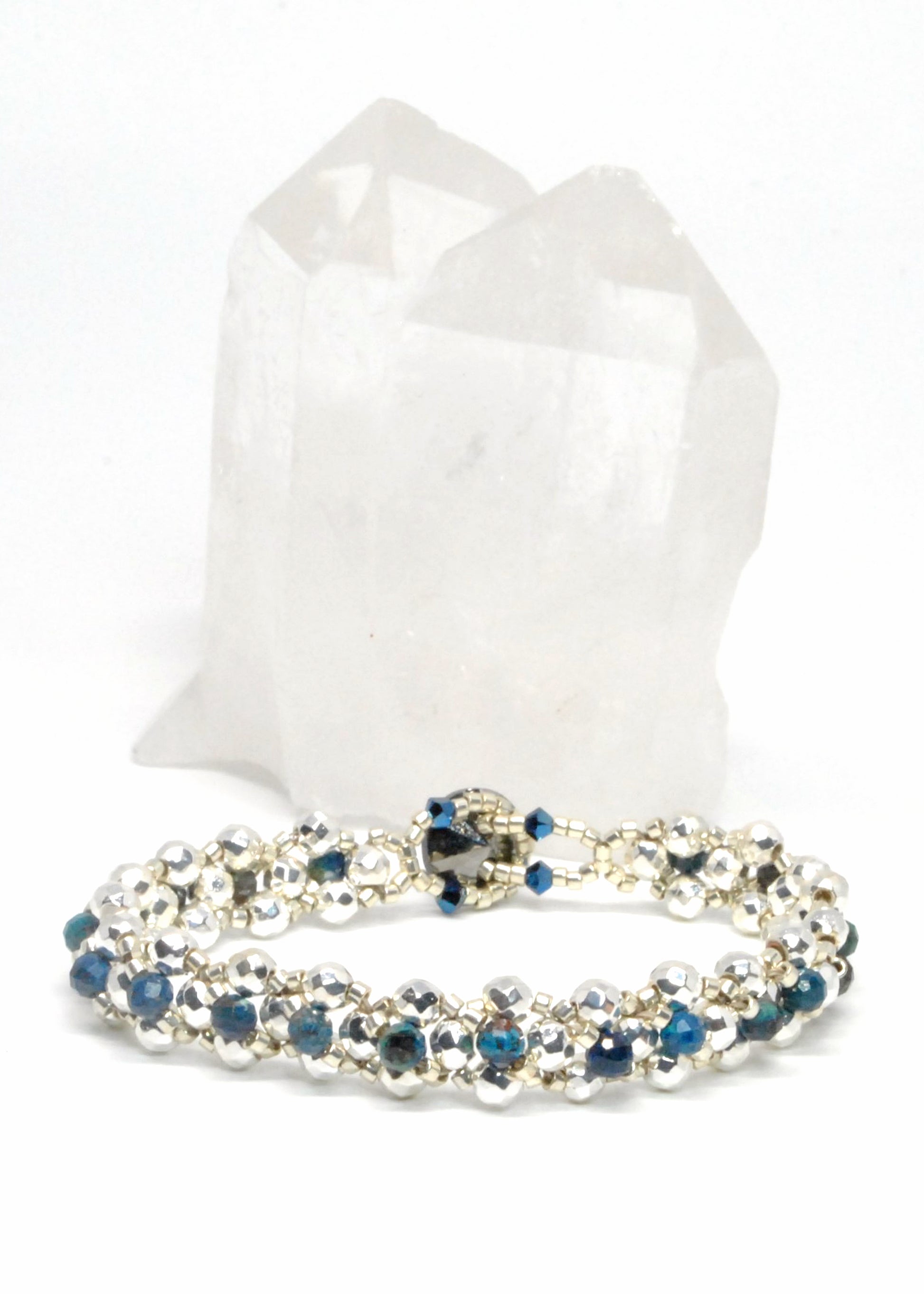 >> this bracelet is created with faceted chrysocolla beads topping a base of white silver-plated hematite faceted beads. the faceting adds additional sparkle and texture to the piece. it is finished with a Swarovski crystal metallic blue button and tiny Swarovski crystals at the closure ends.
