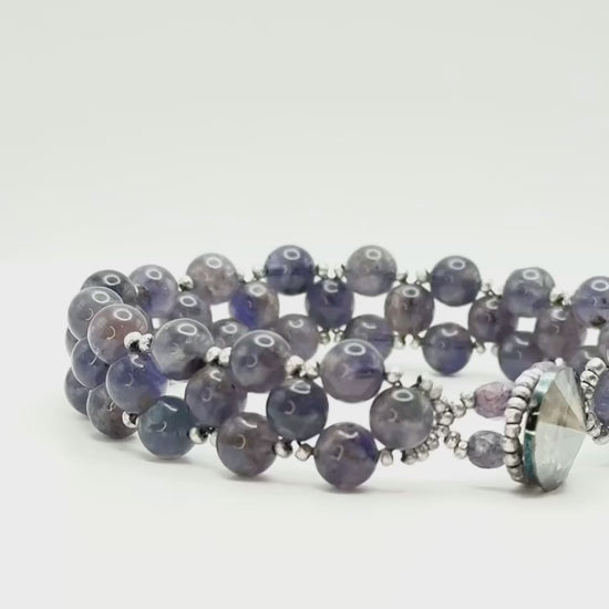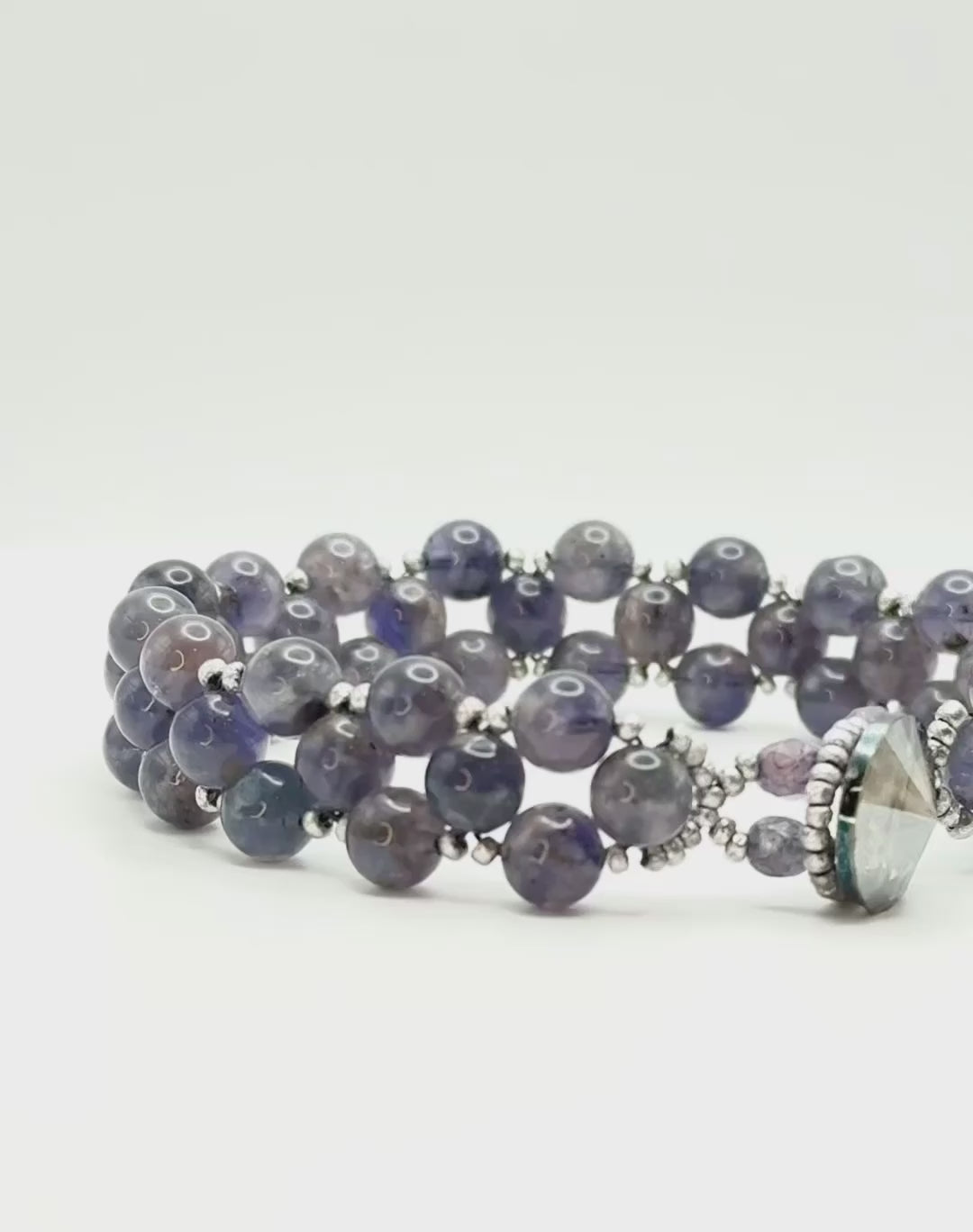>>> this bracelet is woven with multi-toned dark purple/blue-grey iolite gemstone beads and matte silver textured glass seed beads. it is a very unique piece that will go with your fall and winter wardrobes. it is finished with our signature swarovski crystal clasp in a matching satin grey tone.