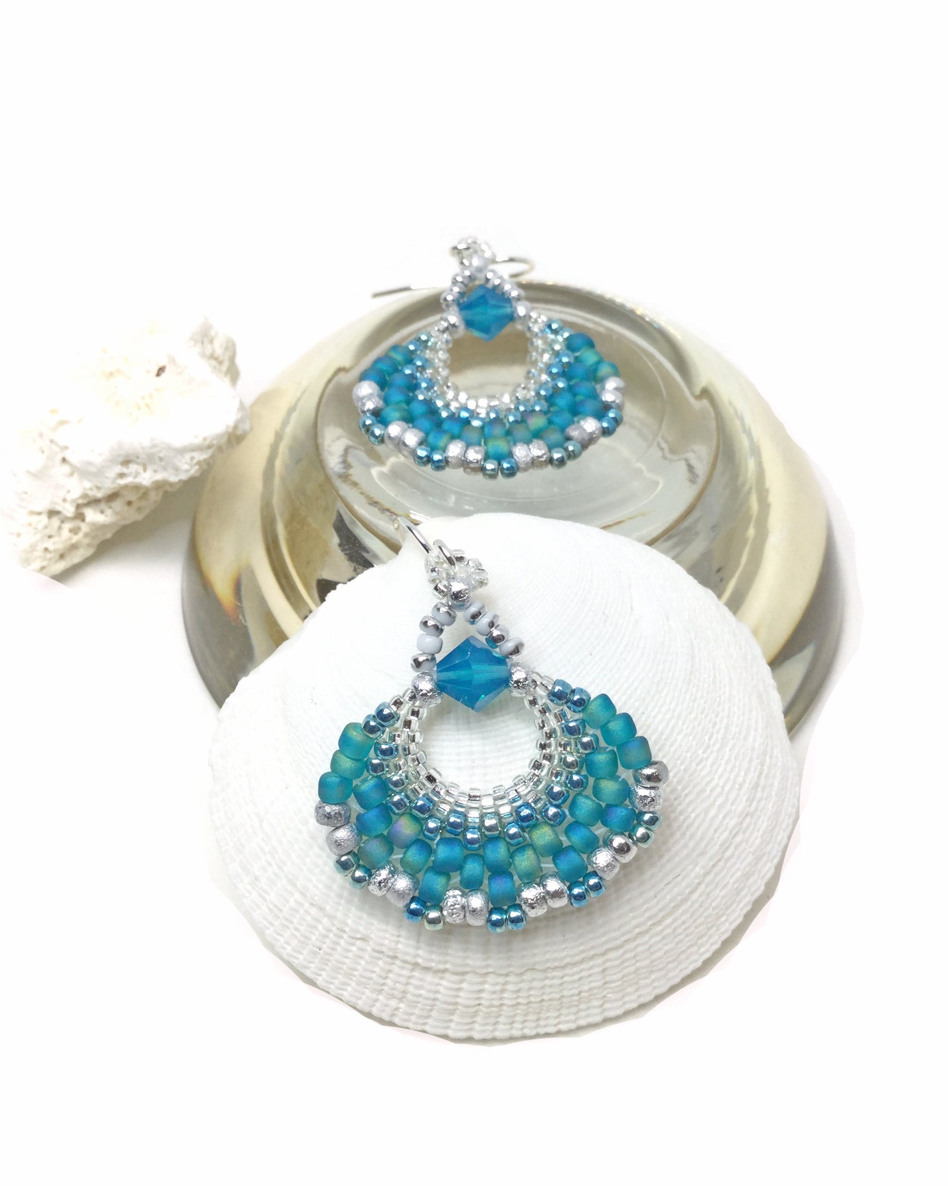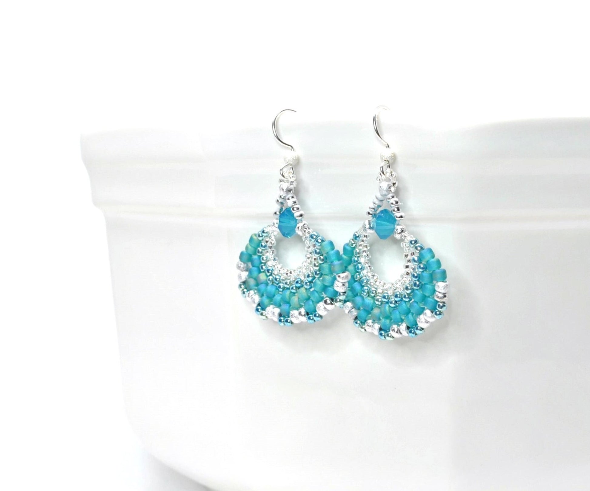 >>> these beaded fan turquoise blue opal earrings are woven with silvery metallic seed beads and accented with turquoise, teal glass seed beads. our fan earrings feature a swarovski crystal accent bead. they are versatile enough to dress up or down.